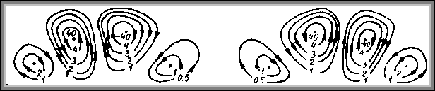 Особенности процесса разогрева иллюстрируются картами линий тока и изотерм, приведенными на рис.4.2. и рис 4.3., (l = 5;D = 0,5*106).