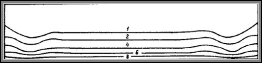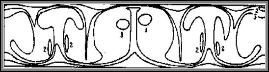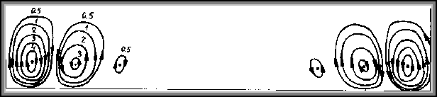 Приведенные выше результаты относятся к развитию конвективных возмущений, первоначально зарождающихся вблизи торцов. Эти возмущения создавались ошибками округления при вычислении температуры на теплоизолированных (торцевых) участках границы. В результате переходного процесса формируется симметричная относительно вертикальной оси полости система конвективных вихрей (рис.4.3.).