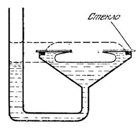 тоже требуется измерить только d и h. Экспериментально d и hопределяются с помощью манометра особом формы, показанной на рис. 11. После тщательной очистки манометр наполняется исследуемой жидкостью, после чего часть жидкости отсасывается так, чтобы образовался пузырек достаточного размера. Затем делается отсчет по манометру и этим определяется положение «дна» пузырька. После этого в прибор добавляют жидкость, чтобы на поверхности стекла, покрывающего широкое колено манометра, образовалась большая капля жидкости (на рис. 11 показана пунктиром). Новый отсчет по манометру даст положение основания капли. Наконец, с помощью специального прибора (сферометра) определяют высоту капли h. Зная толщину стекла, можно теперь из двух отсчетов по манометру определить d и вычислить как коэффициент поверхностного натяжения, так и краевой угол.