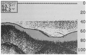 Грязь, песок, и растительность на дне водоема поглощают и рассеивают звуковой сигнал, уменьшая силу отраженных сигналов. Скалы, сланец, кораллы и другие жесткие объекты отражают звуковой сигнал легко. Вы можете видеть различие на экране вашего гидролокатора. Мягкое дно, типа ила, видно как тонкая линия поперек экрана. Жесткое дно, типа скалы, видно как широкая полоса на экране эхолота.