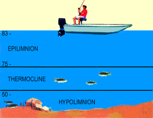 Температура в озере редко одинакова от поверхности до дна. Обычно присутствует теплый уровень воды и холодный уровень. То место где эти слои встречаются, называется термоклин. Глубина и толщина термоклина может измениться с сезоном или временем дня. В глубоких озерах может иметься два или больше термоклина. Это важно, потому что многие хищные разновидности рыбы любят находиться чуть выше или чуть ниже термоклина. Вероятно, что малек чаще находится выше термоклина, в то время как крупная хищная рыба, охотящаяся на него, стоит чуть ниже термоклина. К счастью это различие в температурах может быть замечено на экране эхолота. Чем больший температурный дифференциал, тем более плотный термоклин виден на экране.
