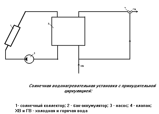 Принципиальная схема установки с циркуляцией воды в контуре КСЭ с помощью насоса подачей холодной воды в бак-аккумулятор и регулированием температуры горячей воды, поступающей к потребителю, путем подмешивания холодной воды в смесительном клапане показана на рисунке.