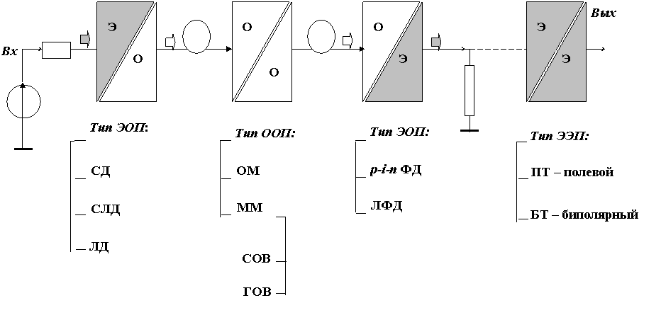 Электро-оптическим (ЭОП), оптико-оптическим (ООП), опто-электрическим (ОЭП) и электро-электрическим (ЭЭП) преобразователями. Они соответственно представляют: