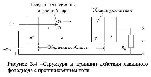 Лавинные фотодиоды обычно являются модификациями p–i–n-диодов. Используемые материалы и области спектральной чувствительности, являются одинаковыми. Один из вариантов ЛФД, называемый “диодом с проникновением поля”, показан на рисунке 3.4. Здесь p+– и n+–слои являются высоколегированными низкоомными областями, на которых происходит очень малое падение напряжения. p–область слегка легирована, т.е. имеет почти собственную проводимость. Большинство фотонов поглощаются в этом слое, создавая электронно-дырочные пары. Как показано на рисунке, фотоэлектроны двигаются в p-область, которая обеднена свободными носителями заряда вследствие большого обратного напряжения смещения. В действительности, обедненная область p–n+-перехода “проникает” в p–область. Наиболее сильное падение напряжения происходит в области p–n+-перехода, где большое электрическое поле вызывает лавинное умножение. В этом приборе умножение начинается электронами. Дырки, сгенерированные в p-области, дрейфуют к p+-электроду и не принимают участия в процессе умножения. Структура, в которой процесс умножения начинается носителями заряда одного типа, имеет хорошие шумовые характеристики.