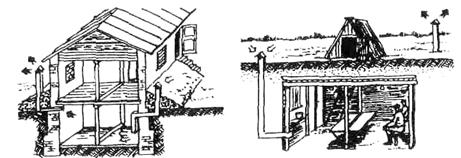 Размещают ПРУ в помещениях, расположенных в подвальных и цокольных этажах зданий (рис. 3.), на первых этажах кирпичных зданий, а также погребов, подпольев, овощехранилищ и других пригодных для этой цели заглубленных пространств (рис. 4.) заключается в выполнении работ по повышению их защитных свойств, герметизации и устройству простейшей вентиляции.