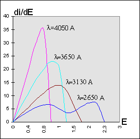Ценную информацию о механизме фотоэффекта могут дать резултаты исследований по энергетическим распределениям фотоэлектронов. Эти исследования проводились либо методом отклонения в магнитном поле, либо методом задерживающего потенциала.Как показали еще ранние иследования в видимой и ближней ультрафиолетовой областях спектра , инергетический спектр фотоэлектронов эмиттированых массивными металлами непрерывен и занимает область от нуля до нектрого максимального значения Емах , определяемого соотношением Энштейна. Было показано , что при hn , близких к hno , энергетический спектр фотоэлектронов слабо зависит от природы металла. Он изображается плавной кривой с максимумом рис.C ростом hn постепенно увеличивается относительное число медленных электронов, но общий характер кривой сохраняется