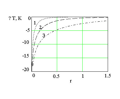Рис 5. Зависимость нестационарной температуры от радиуса скважины при различных временах. Обозначения: 1- t =10 000 с; 2 -100 000 ; 3 – 1 000 000. |