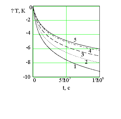 Рис 9. Зависимость нестационарной температуры от времени при различных коэффициентах барической сжимаемости. Обозначения: 1- α =0,0003 Па-1; 2 -0,00001; 3 -0,000001; 4 -0,0000001;5 – 0,0000005. |