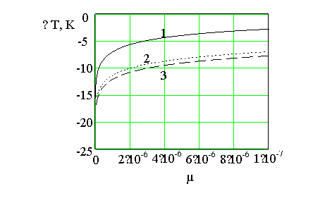 Рис 8. Зависимость нестационарной температуры от относительной вязкости при различных временах. Обозначения: 1- t =100 000 c; 2 -1 000 000; 3 – 1 500 000. |