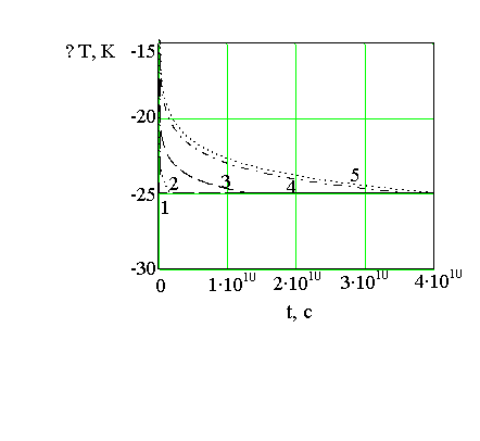 Рис 6. Зависимость нестационарной температуры от времени при различных радиусах контура питания. Обозначения: 1- R =25 м; 2 -50; 3 – 100; 4 -200; 5 - 250. |