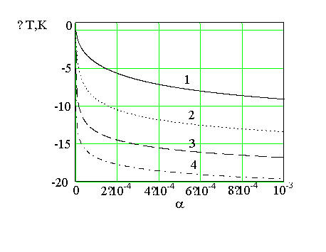 Рис. 10. Зависимость нестационарной температуры от коэффициента барической сжимаемости при различных временах. Обозначения: 1- t = 100 c; 2 -1000 ; 3 – 10 000; 4 -100 000. |