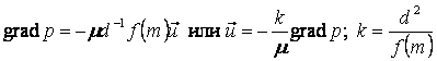 Это соотношение называется законом фильтрации Дарси (по имени французского ученого, установившего его экспериментально в 1856г.). Величина k=d2/f(m), вводимая уравнением (4), носит название проницаемости. Проницаемость имеет разномерность площади; она не зависит от свойств жидкости и является чисто геометрической характеристикой пористой среды.