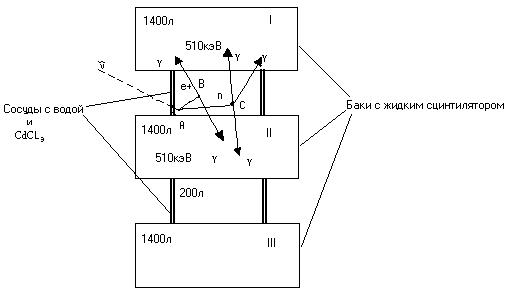 А - точка поглощения нейтрино и появления позитрона и нейтрона. В- точка аннигиляции позитрона, С – точка захвата нейтрона атомом кадмия.