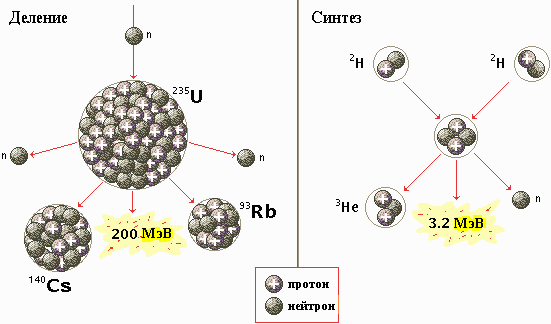 Высвобождающаяся энергия, отнесенная к одному нуклону дейтерия, значительно больше энергетического выхода на один нуклон делящегося изотопа урана-235. Для реализации таких реакций необходимо сблизить ядра на расстояние R ~ 10-14м, затратив энергию k0 e2/R ~ 0,15 ¸0,3 МэВ, поэтому реакции остаются энергетически выгодными. Поскольку тритий очень радиоактивен, то реакция с использованием 3He более безопасна.
