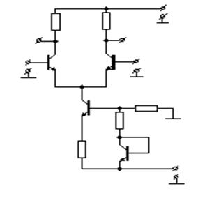 На транзисторе Т3 собрана схема источника стабильного тока Iэ1 и Iэ2 транзисторов Т1, Т2.в схему источника стабильного тока входят резисторы R1, R2, R3 и источник питания Eк2. Транзистор Т4 в диодном включении предназначен для повышения стабильности тока Iэ в зависимости от изменения температуры (элемент температурной компенсации).
