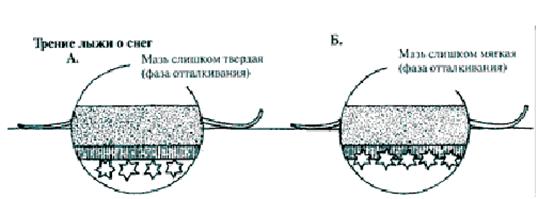 Эта простая картина усложняется тем фактом, что под меньшим давлением, как только заканчивается отталкивание и начинается скольжение, держащая мазь должна быть в состоянии еще и скользить. Скольжение усиливается механическим путем, а именно за счет прогиба лыжи, который приподнимает держащую мазь над снегом во время скольжения. Жесткость лыжи, длина колодки, вес и сила конкретного лыжника также влияют на скольжение.