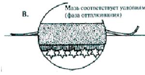 Задача держащей мази - дать возможность кристаллам снега более глубоко проникнуть в мазь, чем в случае с мазью скольжения. Это проникновение "пригвождает" лыжи к снегу, уберегая лыжника от проскальзывания и позволяя ему продвигаться вперед. Здесь будет уместной аналогия с ботинком на резиновой подошве, который находится на ложе из гвоздей.