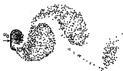 Одной из классических задач является задача об отрывном обтекании пластины, поставленной перпендикулярно набегающему потоку. Если угодно, это модель обтекания запруды, установленной поперек ручья. Еще в начале столетия Карман, постулируя наличие вихревой дорожки с шахматным расположением точечных дискретных вихрей, нашел соотношение между шириной дорожки h и продольным расстоянием между вихрями l: