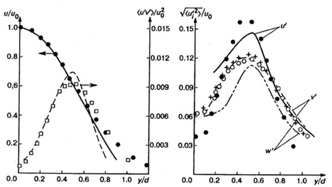 На рис. 4 сопоставляются результаты расчета и эксперимента в сечении x/d=4 для средних пульсаций скоростей истечения