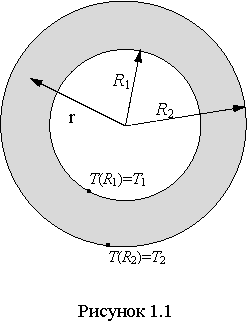 . Вследствие этого температура среды тоже является в данном случае функцией одной переменной - радиуса r: T = T(r), а изотермические поверхности это концентрические сферы. Таким образом искомое температурное поле - стационарное и одномерное, а граничные условия являются условиями первого рода: T(R1) = T1, T(R2) = T2.