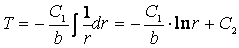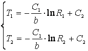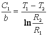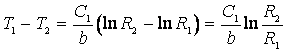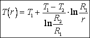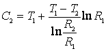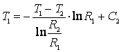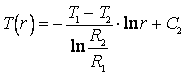 Константы C1 и C2 можно определить из граничных условий T(R1) = T1, T(R2) = T2. Подстановка этих условий в (2.35) даёт линейную систему двух уравнений с двумя неизвестными C1 и C2: