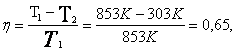 Температура пара, применяемого в современных паротурбинных установках, не превышает 580 °С (температура нагревателя Т1=853 К), а температура пара на выходе из турбины обычно не ниже 30 °С (температура холодильника Т2=303 К); поэтому максимальное значение КПД паротурбинной установки как тепловой машины равно: