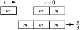Теперь выясним, что произойдет в системе отсчета, которая движется вместе с телом 2m. Как следует из pис. 9б, скоpость тела, обpазовавшегося после столкновения, pавна υ/2. Иными словами (см. pис. 10), после столкновения скорость трех тел будет в три раза меньше скорости налетающего тела. Опять импульс сохраняется!