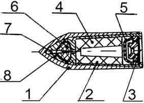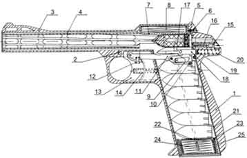 В пистолете применена пуля шрапнельного типа. Состоит она из двух частей, имеющих возможность движения относительно друг друга, но только при приложении значительных нагрузок. В тыльной части первичной пули 2 размещен заряд твердого топлива 4 и сопловый блок 3 с центральным реактивным соплом и кольцевым воспламенителем 5. В передней части размещен заряд метательного ВВ 6 и вторичная пуля 7. Передняя стенка первичной пули имеет передаточное отверстие. Если встреча пули с преградой происходит до полного выгорания реактивного топлива, задняя часть, продолжая двигаться относительно затормозившейся передней, набегает на хвостовик вторичной пули, в результате чего, форс пламени догоревшего реактивного топлива не передается через закрывшееся передаточное отверстие, и пуля действует исключительно приобретенной кинетической энергией реактивного ускорения. В случае когда дистанция превышает 20 .30 метров, выгоревший полностью реактивный заряд передает луч огня через передаточное отверстие к метательному ВВ, которое выбрасывает вперед вторичную пулю. Таким образом, пуля получает новый импульс ускорения и приобретает дополнительную энергию, что сопровождается сбросом части массы. Как и у прототипа, выстрел из предлагаемого пистолета практически бесшумен, а отдача ничтожна, хотя оружие и приобретает небольшой импульс из-за динамического удара истекающих из сопла газов. Пистолет имеет самовзводный ударно-спусковой механизм и заряжается при помощи сменных обойм. Предусмотрена возможность быстро удалить пулю с несработавшим капсюлем и продолжить стрельбу.