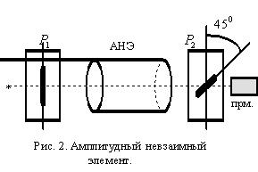 Рассмотрим теперь амплитудные и фазовые невзаимные элементы /АНЭ и ФНЭ/ на основе эффекта Фарадея. В простейшем случае оптика АНЭ состоит из пластинки специального магнитооптического стекла, содержащего редкоземельные элементы, и двух пленочных поляризаторов /поляроидов/. Плоскости пропускания поляризаторов ориентированы под углом
