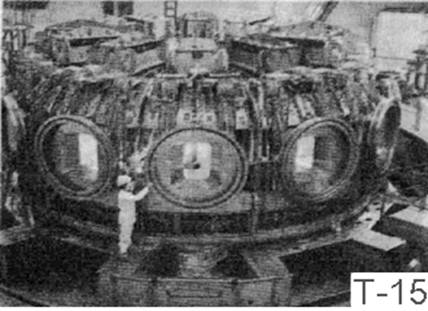 Т - 15 — реактор сегодняшнего дня со сверхпроводящим соленоидом, дающим поле напряжённостью 3,5 Тл. К сожалению, столь важный для развития наших работ по термояду реактор является самым “младшим” в своём поколении, явно отставая от последних зарубежных. Такое отставание — расплата за негибкость нашей промышленности и проектных организаций, отчего каждая новая установка становиться “долгостроем”.