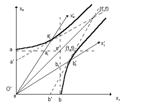 Но преобразования (p) тождественны преобразованиям перехода от декартовых координат к косоугольным. При этих преобразованиях времениподобные векторы, т.е. векторы, направленные из начала отсчета в точки, лежащие выше линии OO', в любой системе координат также останутся времениподобными, т.к. концы векторов лежат на гиперболах. Следовательно, и пространственноподобные векторы во всех системах координат останутся пространственноподобными.