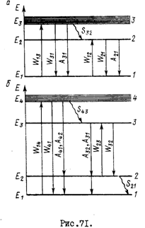 Рассмотрим вначале метод создания инверсии населенностей в средах, описываемых трехуровневой схемой (см.рис.71,а). В нормальном состоянии заселен лишь нижний основной уровень 1 (энергетическое расстояние между уровнями значительно больше kT), так как переходы 1—>2, и 1—>3) принадлежат оптическому диапазону. Переход между уровнями 2 и 1 является рабочим. Уровень 3 вспомогательный и используется для создания инверсии рабочей пары уровней. Он в действительности занимает широкую полосу допустимых значений энергии, обусловленную взаимодействием рабочих частиц с внутрикристаллическими полями.