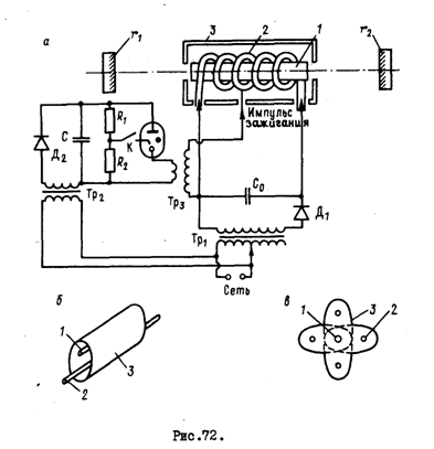 На рис.72, а приведена схема ОКГ на твердом теле. Она включает оптический резонатор, рабочее тело 1 , лампу накачки 2 с отражателем 3 , систему ее питания и зажигания разряда. Оптический резонатор образован зеркалами r1 и r2. Обычно в них используются многослойные интерференционные диэлектрические отражающие покрытия, в которых показатель преломления переменно меняется от слоя к слою. Слои наносят вакуумным напылением или химическим путем, они имеют толщину, равную четверти длины волны в диэлектрике на рабочей частоте. С увеличением количества слоев коэффициент отражения возрастает. При n=15 и больше он превышает 99%.