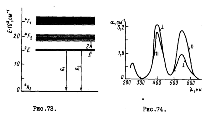 На рис.73 приведена система нижних энергетических уровней ионов хрома. Она существенно отличается от системы уровней свободных ионов, что связано со взаимодействием ионов с сильными