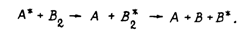 2. Соударения второго рода между разнородными атомами смеси двух газов. При соударении атомов, один из которых - А* -находятся в возбужденном состоянии, а другой - В - в основном, происходит передача возбуждения от первого атома ко второму. При этом первоначально возбужденный атом переходит в основное состояние, а партнер по соударению - в возбужденное состояние :