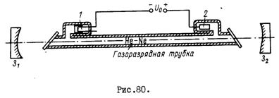 На рис.80 показано схематическое устройство газового ОКГ. Он состоит из двух основных частей: открытого резонатора, образованного зеркалами 3^ и 3^ , и газоразрядной камеры, наполненной рабочей смесью He-Ne .