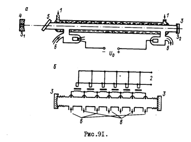 Разрад в рабочей смеси газов сопровождается диссоциацией и изменением исходного состава газа. Поэтому очень часто, особенно в мощных ОКГ, используется непрерывная прокачка газа (б) через разрядную трубку.