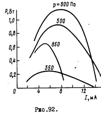Рассмотрим основные характеристики ОКГ на COg . На рис.92 показана зависимость выходной мощности от силы тока разряда паи различных давленяях СОп для ОКГ с отпаянной трубкой длиной I м и диаметром 10 мм. Сначала мощность возрастает вместе с током, а затем падает. Такая зависимость объясняется конкуренцией двух факторов. Увеличение концентрации электронов, о одной стороны, ведет к возрастанию скорости возбуждения молекул СОп на уровень (00^1), а с другой,- повышает газовую температуру, что увеличивает ^ скорость разрушения антисимме-- тричных колебаний молекул.