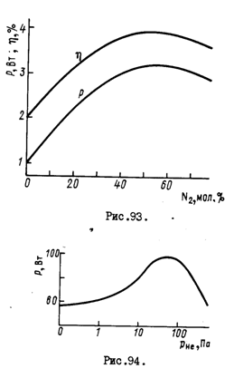 Существенное влияние на энергетические характеристики ОКГ на COp-Nn оказывает введение в разрядную камеру гелия (рис.94)1 Гелий, обладая теплопроводностью, в несколько раз превышавшей теплопроводность СОв^ и Nn, снижает газовую температуру, что способствует увеличению инверсной населенности, а значит,и выходной мощности. Кроме того, с введением в разряд гелия воз