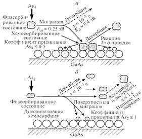 Атомы, попадающие на подложку, адсорбируются на поверхности. На первом этапе это представляет собой адсорбцию за счет слабых ван-дер-ваальсовых и (или) электростатических сил — этап физсорбции. На втором этапе молекулы вещества переходят в хемосорбированное состояние, при котором происходит электронный перенос, т. е. химическая реакция между атомами поверхности и атомами вновь поступившего вещества. Энергия связи при химической адсорбции больше, чем при физической.