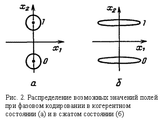 Однако емкость информационного канала не единственная важная характеристика системы связи. Очень важной является вероятность появления ошибок, особенно в линиях связи компьютеров. Выигрыш применения сжатого света при этом можно продемонстрировать на примере линии, в которой двоичные сигналы 0 и 1 кодируются сигналами, сдвинутыми по фазе на π (рис. 2). При когерентном состоянии (рис. 2, а) сигналы описываются относительно широкими распределениями, из-за перекрытия которых могут возникать квантовые ошибки. При сжатом свете (рис. 2, б) той же интенсивности перекрытие распределений существенно меньше. Расчет показывает, что вероятности ошибок при когерентном и сжатом свете соответственно равны