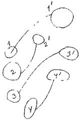 Описание движения жидкости методом Лагранжа сводится к рассмотрению положения частиц жидкости (в полном смысле слова) в любой момент времени. Так в начальный момент времени частицы находились в точках 1, 2, 3 и 4. По истечении некоторого времени они переместились в точки: Г, 2',3'и4', причём это перемещение сопровождалось изменением объёмов и форм частиц (упругой деформацией). Тогда можно утверждать, что частицы жидкости при