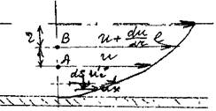 Теперь рассмотрим некоторую частицу жидкости находящуюся в точке А Пусть эта частица переместилась в соседний слой жидкости и углубилась в него на длину пути перемешивания, т.е. оказалась в точке В. Тогда расстояние между этими точками будет равно /. Если скорость жидкости в точке А будет равна и, тогда скорость в точке