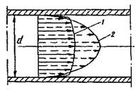 Распределение скоростей по сечению турбулентного потока. Наблюдения за величинами осреднённых скоростей в турбулентном потоке жидкости показали, что эпюра осреднённых скоростей в турбулентном потоке в значительной степени сглажена и практически скорости в разных точках живого