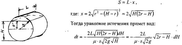Истечение жидкости из горизонтального цилиндрического резервуара. В отличие от вертикального резервуара, площадь сечения свободной поверхности и горизонтального сечения резервуара - величина переменная и зависит от уровня жидкости в резервуаре.