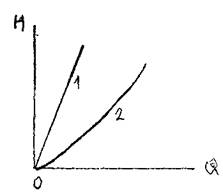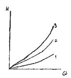 теристики. Вид гидравлической характеристики зависит от режима движения жидкости в трубопроводе: при ламинарном движении жидкости гидравлическая характеристика трубопровода - прямая линия, проходящая через начало координат (1). При турбулентном режиме гидравлическая характеристика - парабола (2).