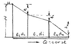 трубопроводов, последние в литературе называются участками этого трубопровода. Расход жидкости во всех участках сложного трубопровода остаётся одинаковым Q = const. Общие потери напора во всём трубопроводе будут равны сумме потерь напора во всех отдельных его участках.