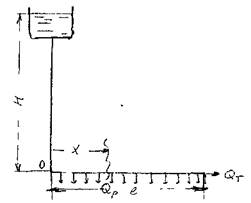 распределённые потребители жидкости. Классическим примером такого трубопровода может служить оросительная система. В начальной точке трубопровода напор составляет Н. В общем случае, расход по трубопроводу состоит из транзитного Qm и расхода Qp ,который непрерывно раз