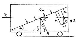 При данных условиях вектор единичной массовой силы переносного движения а будет направлен в сторону противоположную движению цистерны, ускорение свободного падения g, как всегда ориентировано вертикально вниз, т.е. как показано на рисунке. При движении цистерны начальное положение свободной поверхности жидкости изменится. Новое положение свободной поверхности жидкости, согласно основному условию равновесия жидкости будет направлена перпендикулярно вектору