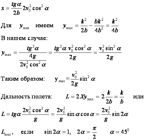 Все записанное справедливо, если отсутствует или достаточно мало сопротивление среды, в которой движется материальная точка. Таким образом, наибольшая дальность полета в отсутствии сил сопротивления наблюдается при движении тела под углом в 45° к горизонту.